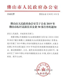 根據《佛山市高新技術企業樹標提質行動計劃(2018-2020年)》關于樹立規模以上高新技術企業創新發展標桿的重要工作,為加快推動創新驅動發展戰略,堅持高新技術企業數量增長與質量提升并舉,佛山市開展了2019年佛山市標桿高新技術企業50強測評。在經過數據測評、匯總、排序及各區推薦名單對比等環節,集團公司成員企業佛山新鵬機器人技術有限公司入選“佛山市標桿高新技術企業50強”。