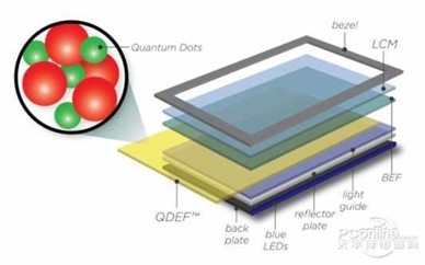 通俗點說,目前的量子點顯示器就是在VA面板中加了一張膜,也就是上圖中的那張QDEF膜。