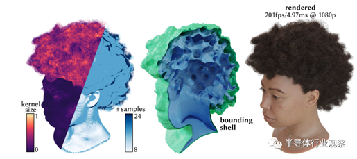第二個重要研究是由Nvidia發表的Adaptive Shells for Efficient Neural Radiance Field Rendering。神經輻射場(Neural Radiance Field,NeRF)和3D GS類似,都是可以通過場景的多角度圖片來完成場景的超高精度建模,并且其建模方式也是通過人工智能模型訓練的方法來完成。NeRF和3D GS的主要不同在于,其建模方法是通過神經網絡來完成,因此其渲染過程就是等價于神經網絡的推理過程。NeRF出現已經有了數年,但是直到今年Nvidia的研究發表,才真正實現了GPU上高幀率(100-200fps)的高質量NeRF渲染,因此今年可望是NeRF渲染真正進入實用的開始。
