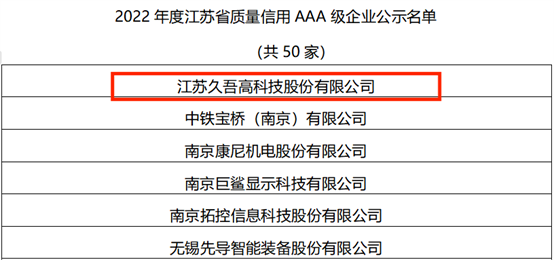 久吾高科榮獲“2022年度江蘇省質量信用AAA級企業”等級認定榮譽稱號2022-03-21