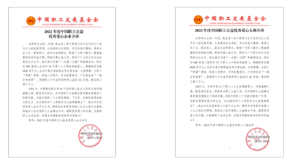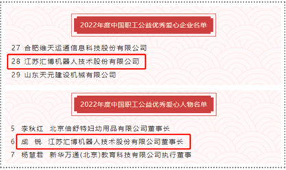 2022年11月30日,中國職工發展基金會公布2022年度中國職工公益優秀愛心企業名單和2022年度中國職工公益優秀愛心人物名單。江蘇匯博機器人技術股份有限公司榮獲“優秀愛心企業”稱號。
