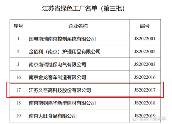 2022年3月10日,江蘇久吾高科技股份有限公司啟動了“2022年度江蘇省綠色工廠認定”申報工作,旨在積極響應《江蘇省“十四五”工業綠色發展規劃》和江蘇省綠色制造體系建設工作部署要求,圍繞省級綠色工廠認定工作的各項評價指標,加快綠色制造體系建設和綠色低碳轉型,實現企業高質量可持續發展。近日,江蘇省工業和信息化廳公布了2022年度江蘇省綠色工廠名單,久吾高科實力上榜,獲評“江蘇省綠色工廠”。