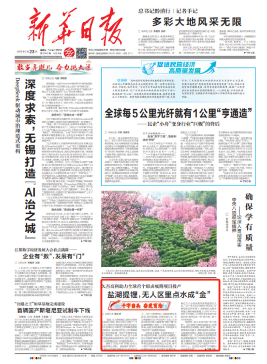 3月23日,《新華日?qǐng)?bào)》頭版聚焦久吾高科助力全球首個(gè)原鹵吸附項(xiàng)目投產(chǎn),久吾高科團(tuán)隊(duì)在極端惡劣的環(huán)境下,克服冬季施工輔材凝固難題,以日均16個(gè)小時(shí)的工作強(qiáng)度,與5家同類企業(yè)進(jìn)行現(xiàn)場(chǎng)比拼,最終交出一份“高分卷”,拿下75%的標(biāo)段。