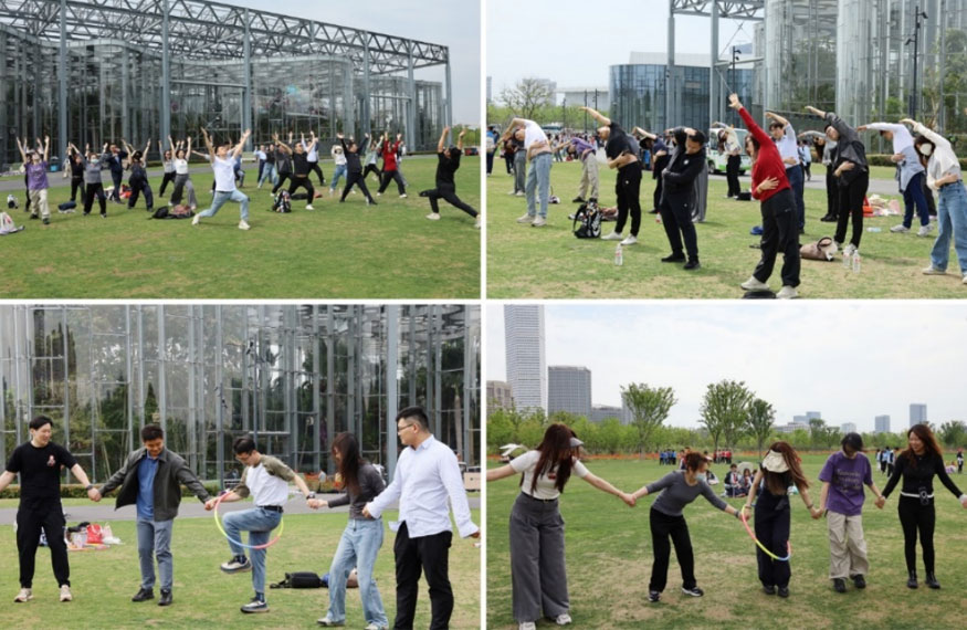 午后兩點的星光草坪上,陽光透過云層灑落,隨著教練熱情洋溢的指導,大家開啟了活力熱身,現場氣氛迅速升溫。緊接著,團隊挑戰任務拉開帷幕,大家隨機分為兩隊,一場趣味與挑戰并存的呼啦圈傳遞游戲正式開始。每隊成員手拉手站成一排,呼啦圈在隊員們緊密協作下,依次穿過每位隊員身體,全程不得松開雙手。各隊成員為了爭取更快的速度,默契配合、齊心協力,吶喊助威聲此起彼伏,不僅鍛煉了身體協調性,更在歡聲笑語中深化了團隊合作。